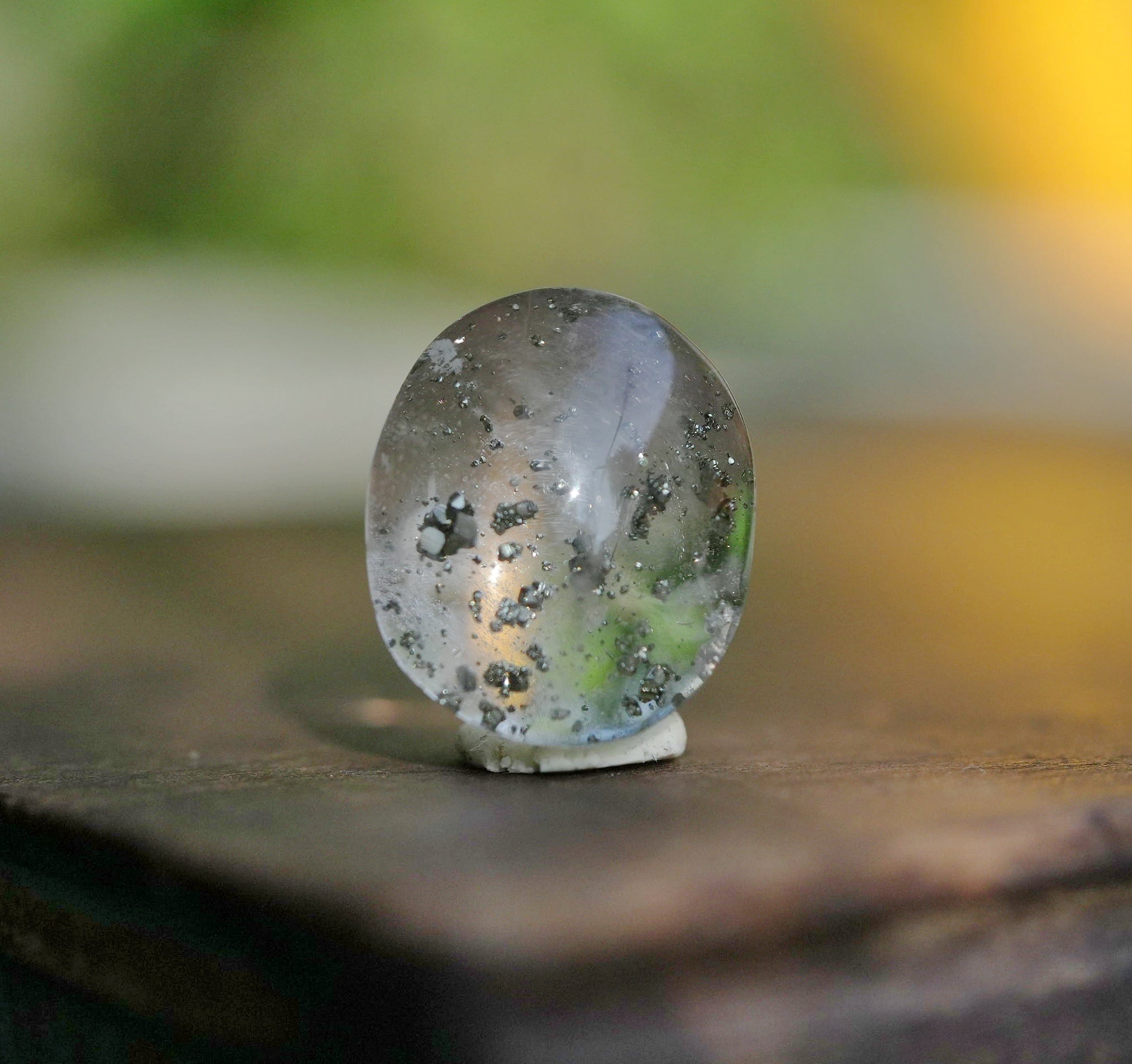 透明~半透明のクォーツの中に、金色や銀色に輝くパイライトが閉じ込められています。