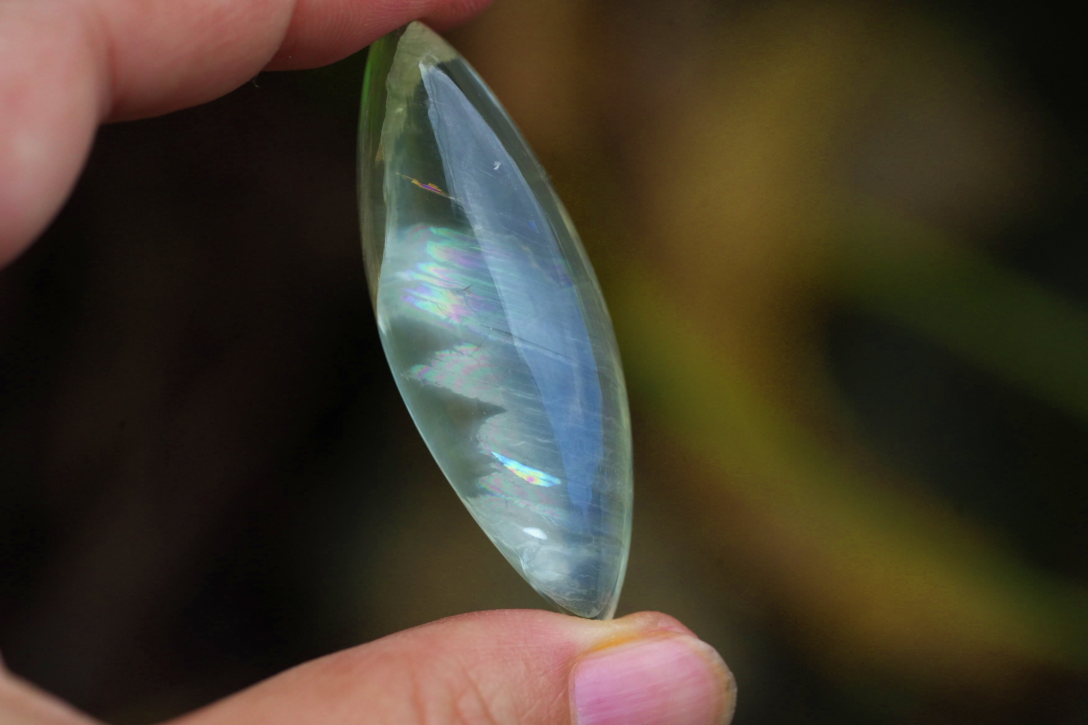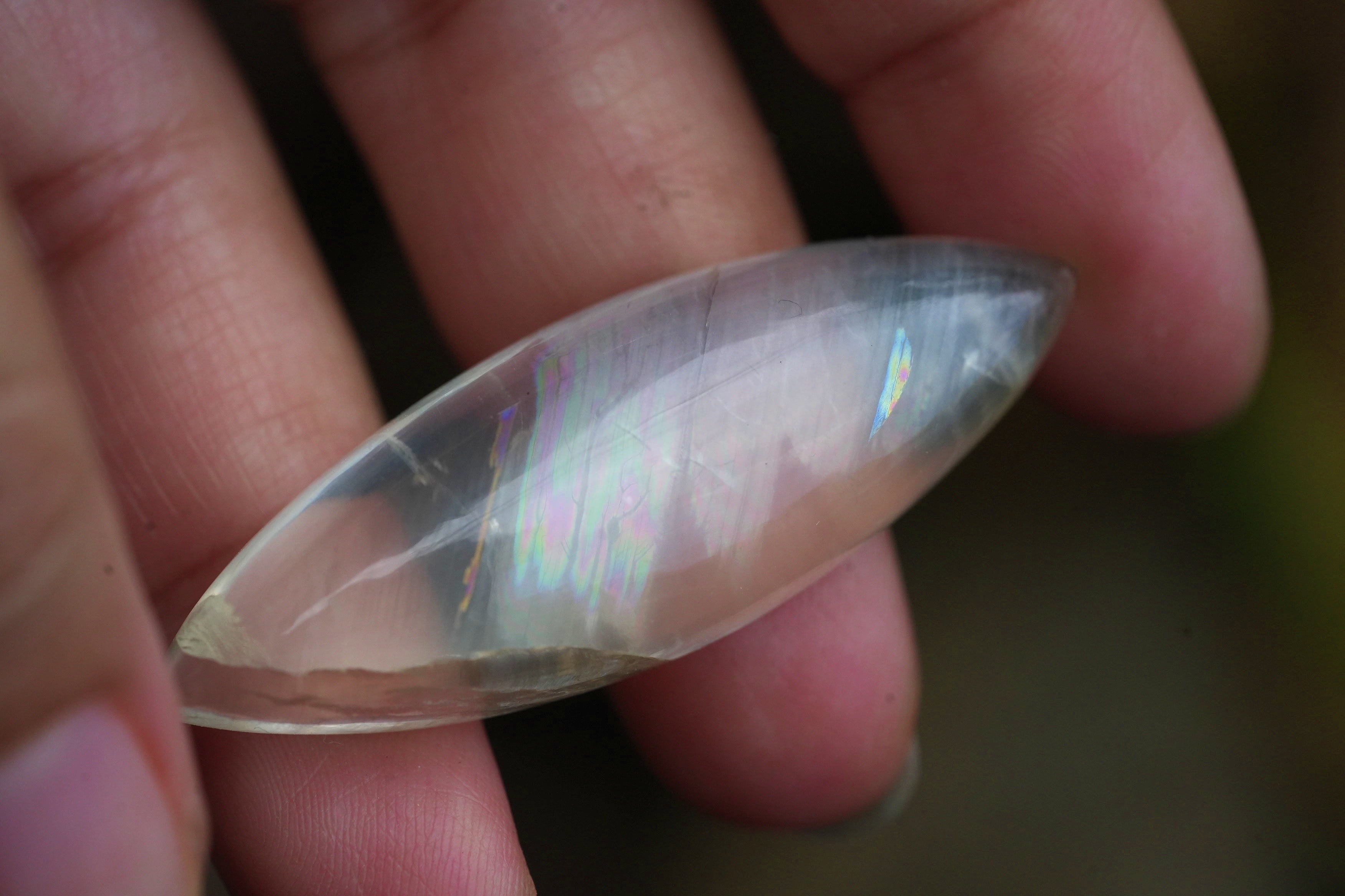 虹色のシラー(ラティス効果): 通常のムーンストーンが青や白の光を放つのに対し、マラウイ産は石の内部に虹色の層や筋状の光(レインボーラティスのような輝き)が見えるのが特徴です。