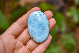 大ぶりなルースであり泡のようなシャトヤンシーの入り方とスカイブルーが魅力的なラリマーです。インドで研磨されたラリマー。