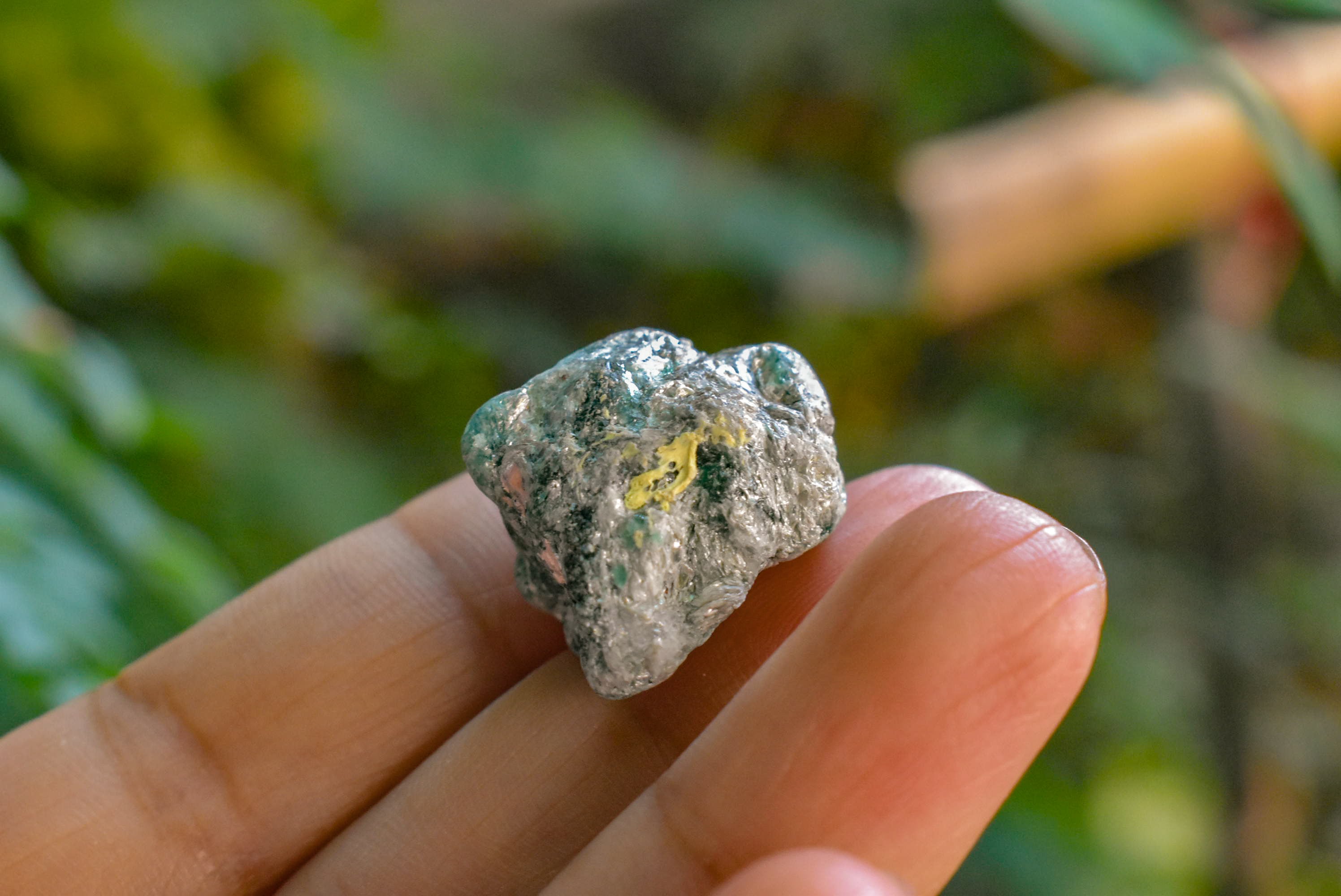 キラキラとパイライトが入り込んだエメラルド原石です。