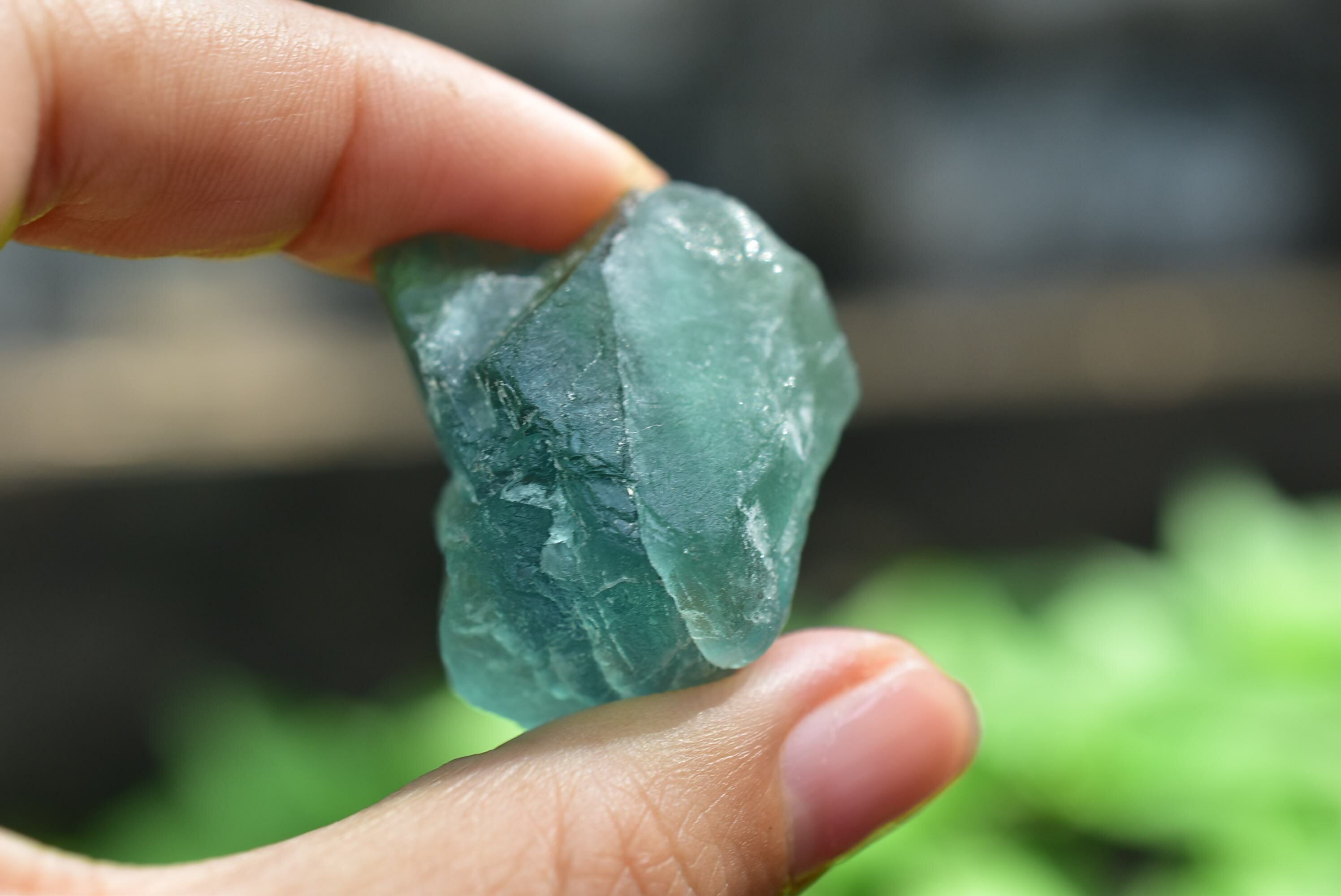 美しいグリーンブルーカラー。光にかざすと透明感もあるフローライト原石。