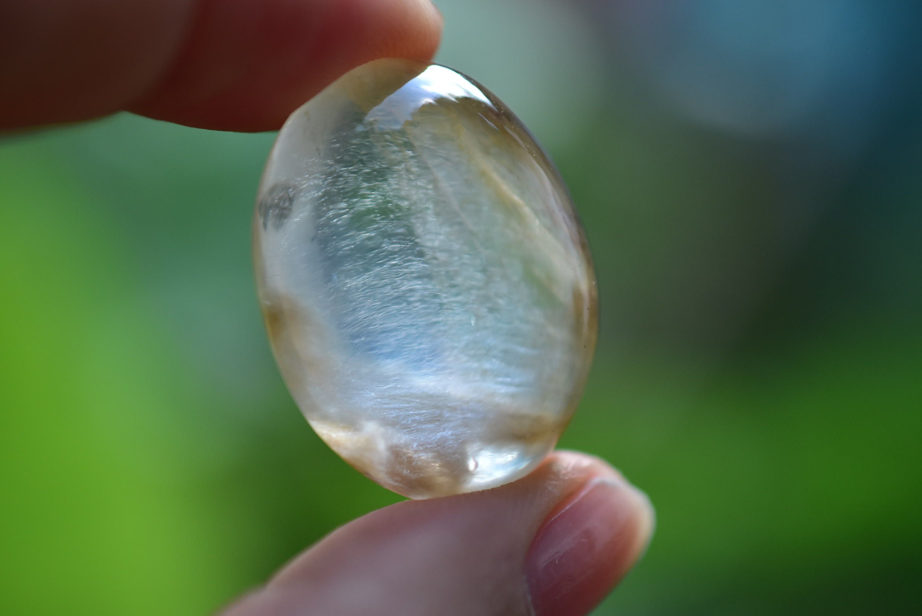 透明度高いクォーツに、ゆるりと入ったベージュのアンフィボール(角閃石)