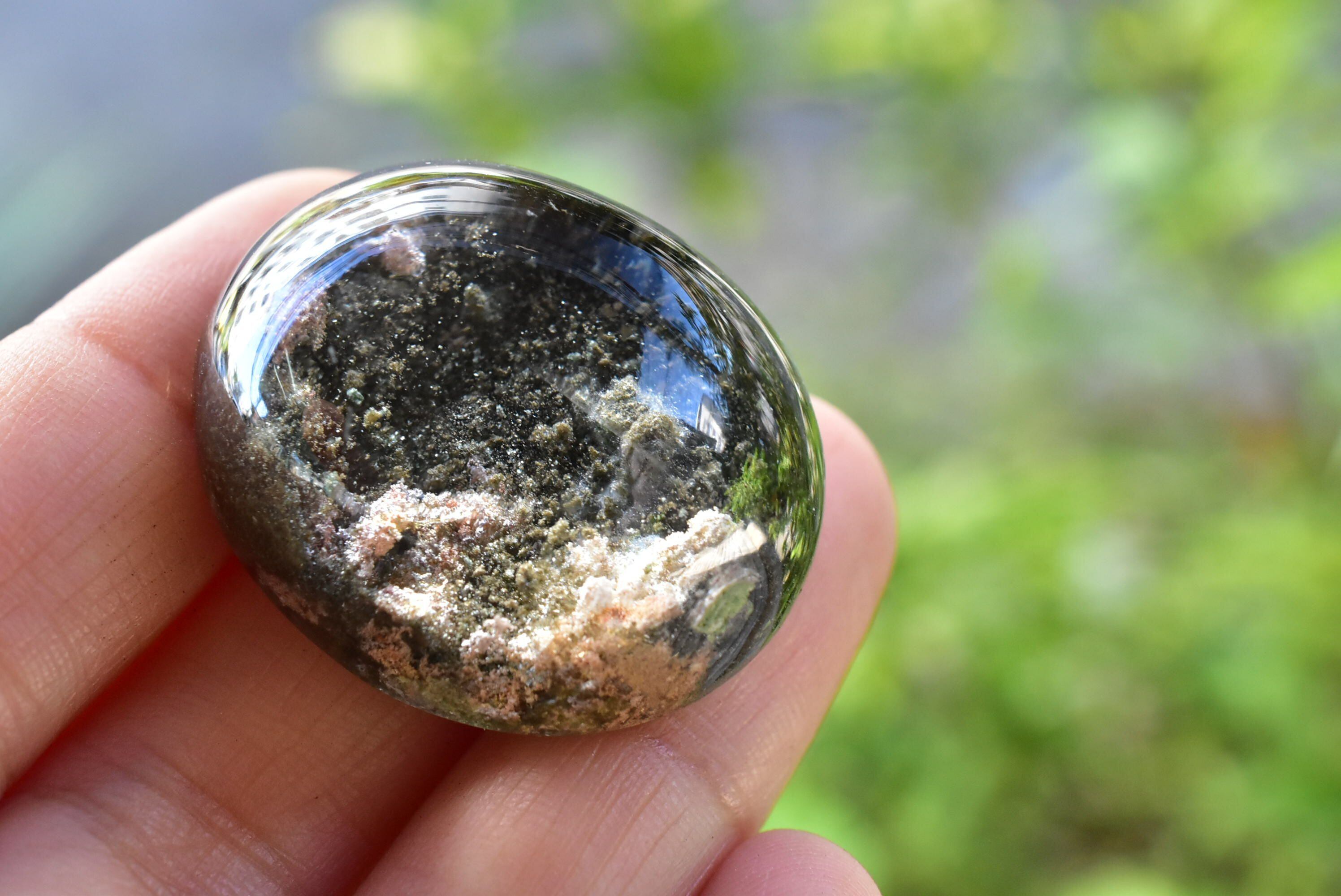 深いモスグリーンのクローライトが絨毯のように広がる大粒のガーデンクォーツ