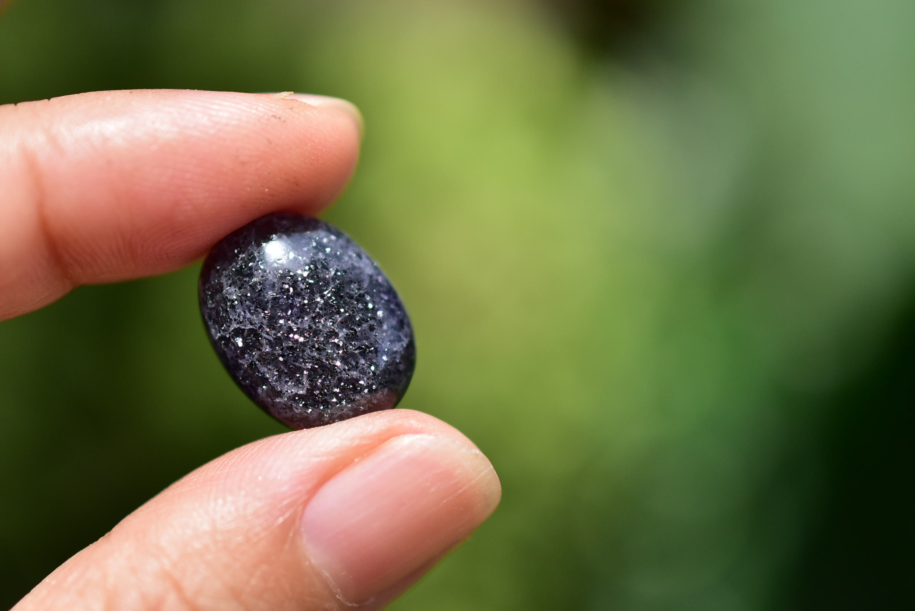 濃藍色のアイオライトに、サンストーンのラメ光沢がキラキラと光を放ちます。