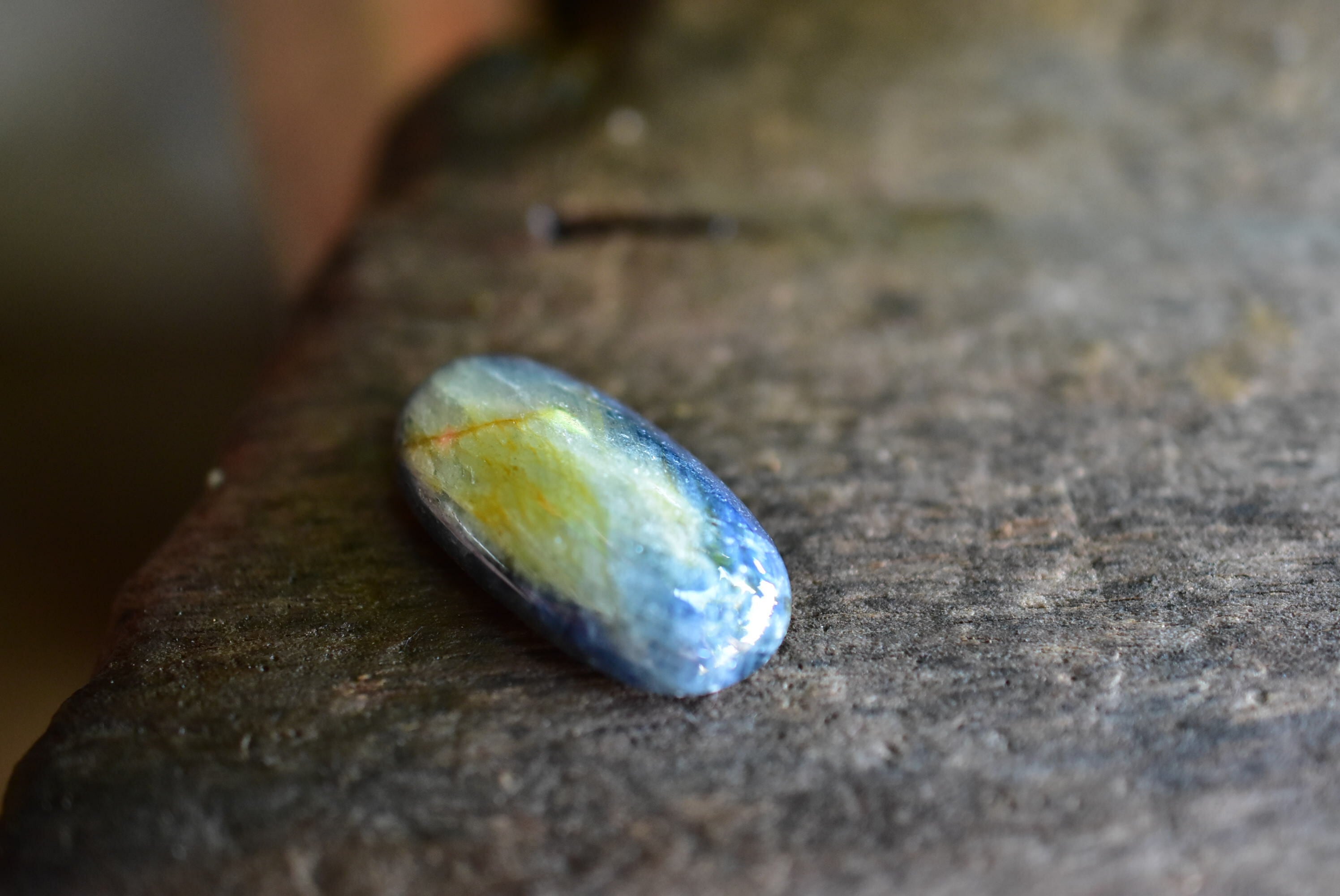 鮮やかなブルーと、淡いイエローカラーが混じりあった天然石は