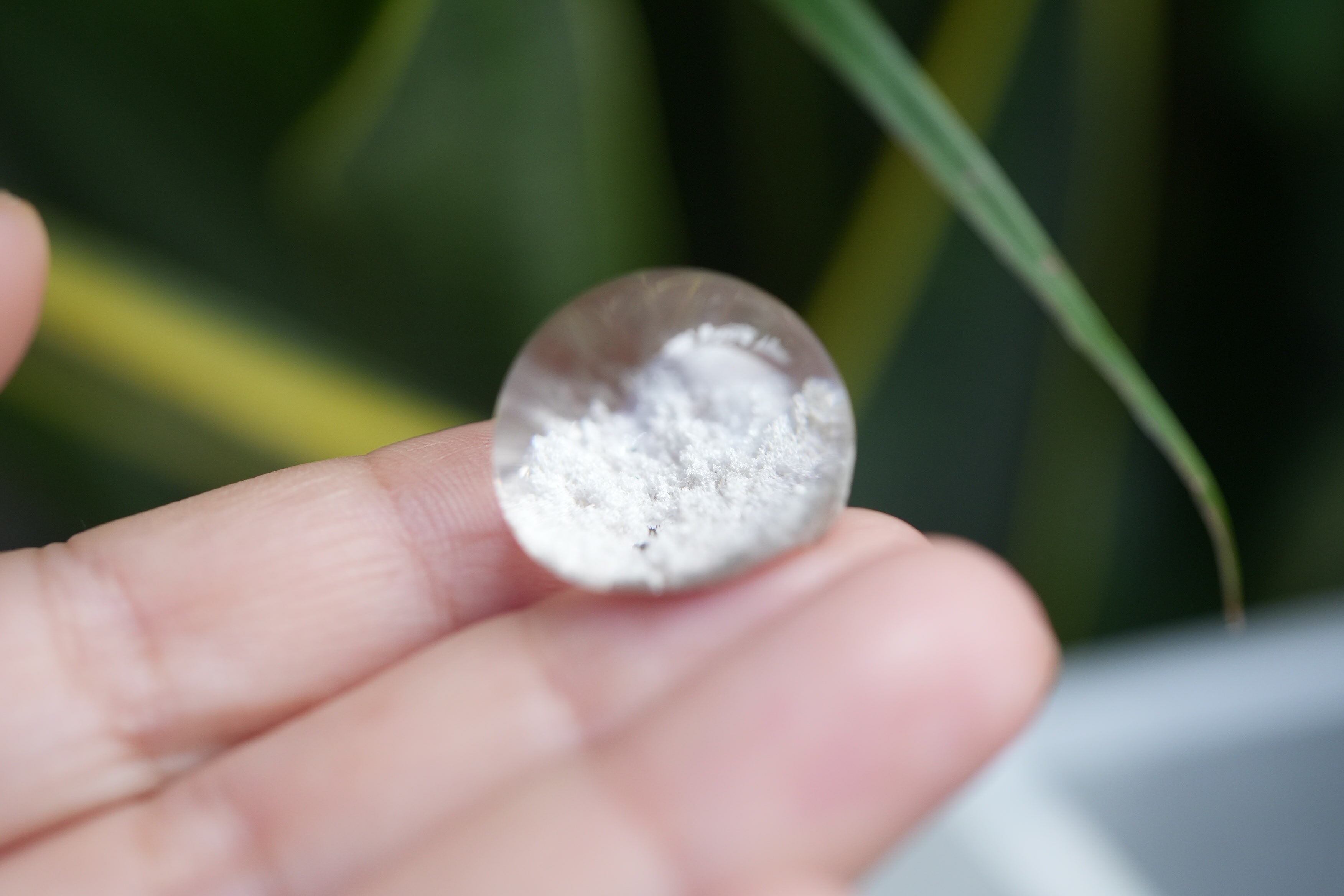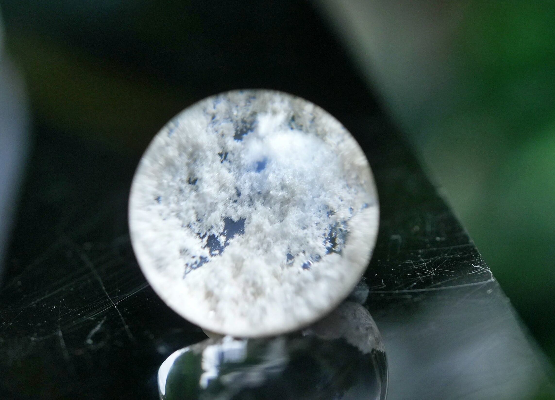 大きめサイズぷっくりハーフ円球ボールのような水晶の中に真っ白ホワイティな内包物がサラッと降り注ぐように見える優しい色合いのホワイトガーデン水晶。
