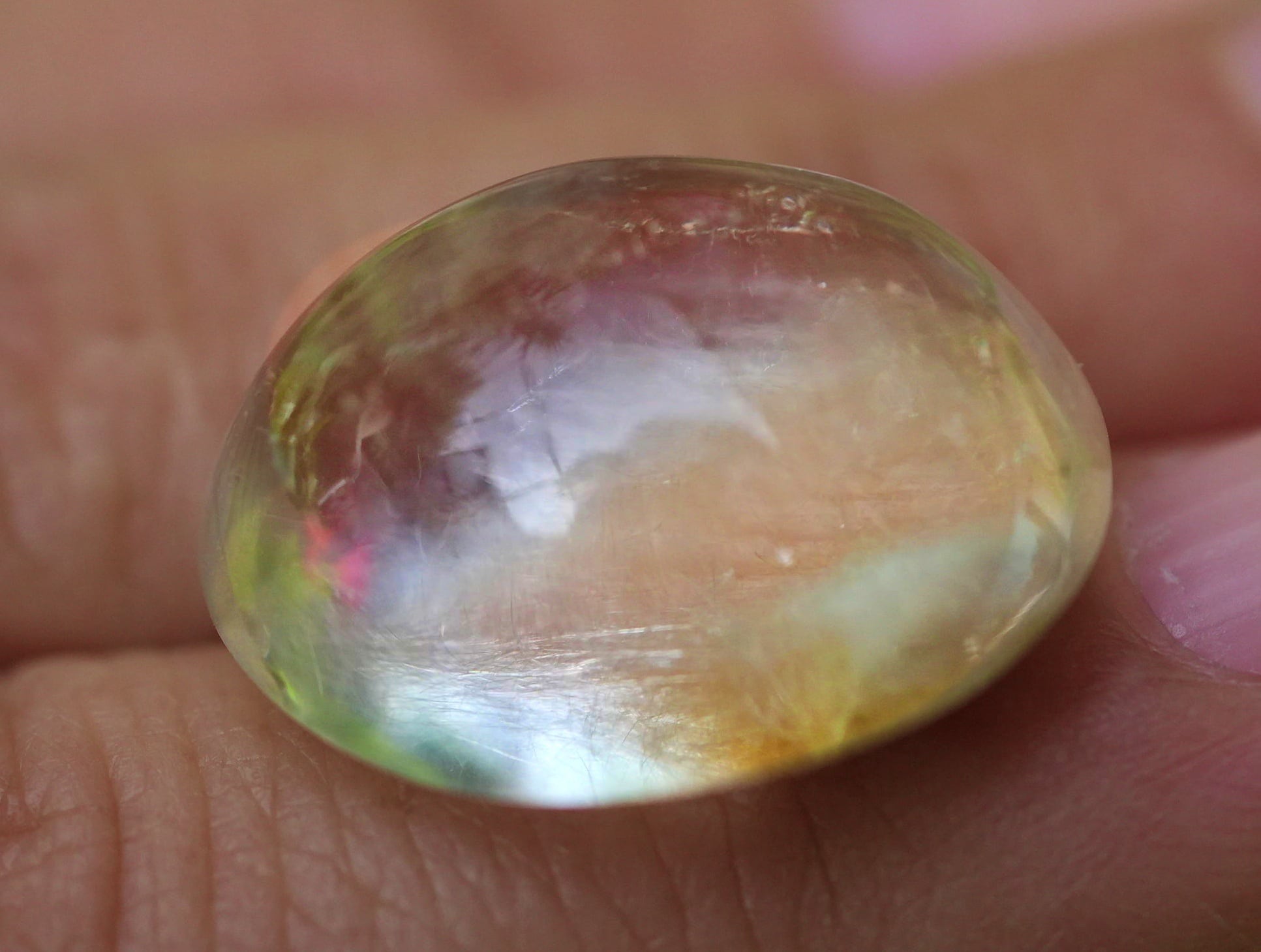 ピンクのふわふわが見えるキュートなイメージのアンフィボールインクォーツ。